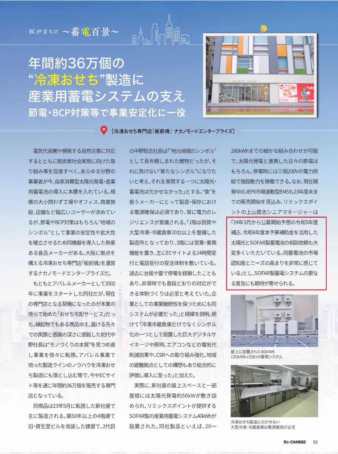 ÈÕ±¾Nakano Mode¹«Ë¾£¬´óÚæ×ÅÃûµÄ¡°°åǰ»ê¡±Àä¶³ÄêÒ¹·¹Æ·ÅÆÔËÓªÉÌ¡£ÎªÓ¦¶ÔÄÜÔ´±¾Ç®ÉÏÉý¼°×ÔÈ»ÔÖÄÑ´øÀ´µÄ¸ß±¾Ç®ÌôÕ½£¬Nakano ModeÏȺóÒý½ø50kWÌ«ÑôÄܰåºÍRemix Point¹«Ë¾ÌṩµÄ888¼¯ÍŹÙÍøµÇ¼Èë¿Ú40kWh¹¤Òµ¼¶´¢ÄÜϵͳ¡£¸Ã´¢ÄÜϵͳ¿ÉʵÏÖ20~280kWhµÄϸÄå×éºÏ,²»µ«¿ÉÒÔÓëÌ«ÑôÄÜ·¢µçÁª¶¯ÊµÏÖÒ»Ñùƽ³£½Úµç,Í£µçʱ»¹ÄÜÌṩÈýÏà200VµçÁ¦Çý¶¯ÉèÊ©¶¯Á¦¡£